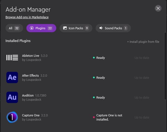 Through the Add-on Manager you can update your plugins and icon packs, see their statuses and install/uninstall assets.