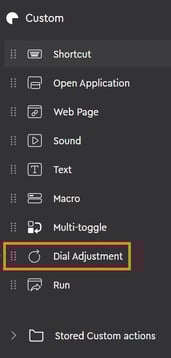 To create a new custom adjustment select Custom Tab in the Loupedeck software UI and Dial Adjustment from the custom actions list.