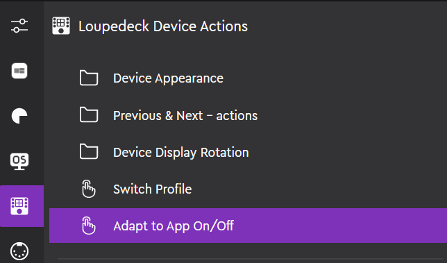 - Adapt To App On/Off - press action can be found in the action panel under Loupedeck Device Actions
