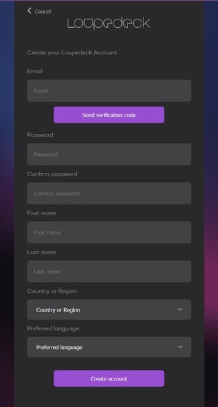 To move forward with the registration process, please enter your email address and click on Send verification code button. After that, please fill in the the additional fields and create your Loupedeck account.