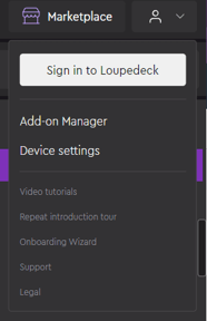 Loupedeckソフトウェア画面の右上のアイコンメニューを開くとアドオンマネージャーが表示されます。
