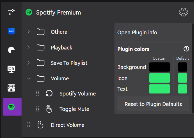 Press on the option wheel icon on the upper right side of the plugin actions. This opens up the plugin color options - you can define new default plugin icon, text and background colors. Any change you make, is made for all the actions in that plugin at the same time.