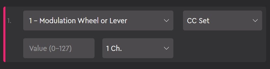 CC Function. Follows the MIDI standard list, values from 1 to 119.