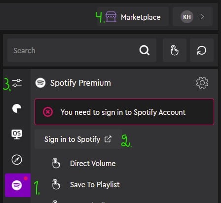 * If Spotify plugin is not visible under Plugin Manager, it needs to be downloaded from the Marketplace (4).